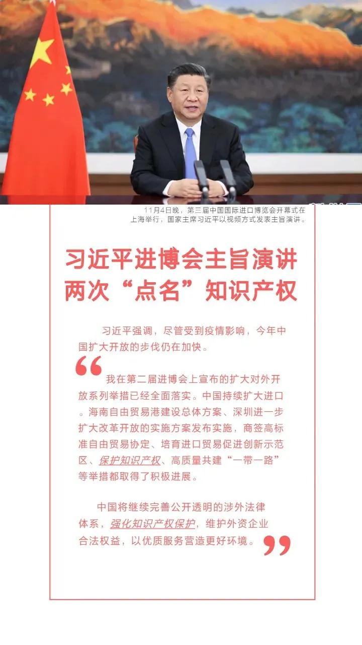 第一次是,作為擴大對外開放的舉措之一,肯定知識產(chǎn)權(quán)取得積極進展;第二次是,在宣布中國全面擴大開放的新舉措中,再次強調(diào)"強化知識產(chǎn)權(quán)保護。"