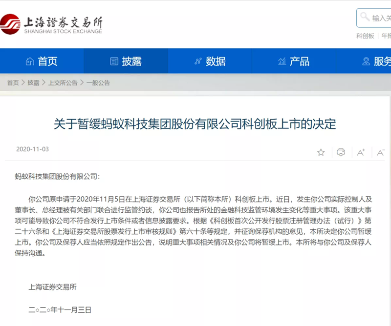 11月3日晚間,上海證券交易所發(fā)布《關于暫緩螞蟻科技集團股份有限公司科創(chuàng)板上市的決定》(下稱《決定》,詳情見下圖1),根據(jù)該《決定》,被稱為“本年度全球最大IPO”的螞蟻科技集團股份有限公司(下稱螞蟻科技集團)被暫緩上市。