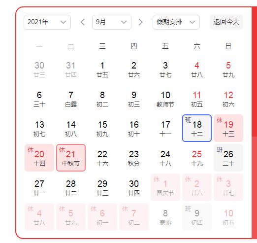 2021年中秋節(jié)放假時間為2021年09月19日至2021年09月21日,共3天。9月22日(周三)正式上班。節(jié)日期間如果您有任何問題,可以直接聯(lián)系13562755233