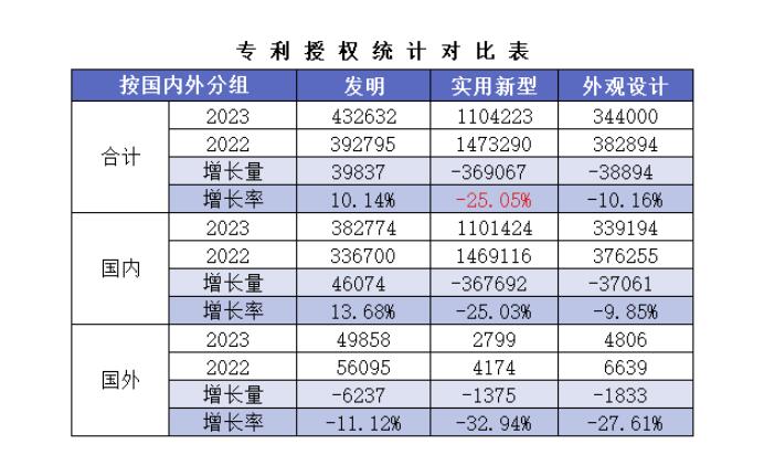 實(shí)用新型專利授權(quán)量減少369067件,下降25.05%,下降幅度較一季度進(jìn)一步擴(kuò)大;