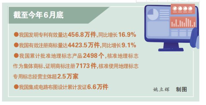 截至今年6月底,我國發(fā)明專利有效量達(dá)456.8萬件,同比增長16.9%;我國國內(nèi)擁有有效發(fā)明專利的企業(yè)達(dá)38.5萬家,共擁有有效發(fā)明專利260.5萬件,占國內(nèi)總量的七成以上;2022年5月加入《工業(yè)品外觀設(shè)計(jì)國際注冊海牙協(xié)定》以來,我國申請人月均提交外觀設(shè)計(jì)國際申請超過150件,位居全球前列……