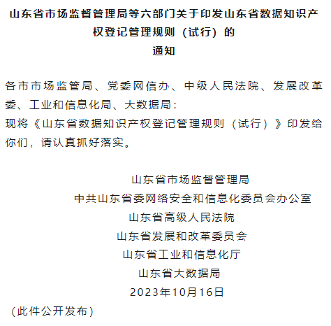 山東省市場(chǎng)監(jiān)督管理局等六部門關(guān)于印發(fā)山東省數(shù)據(jù)知識(shí)產(chǎn)權(quán)登記管理規(guī)則(試行)的通知