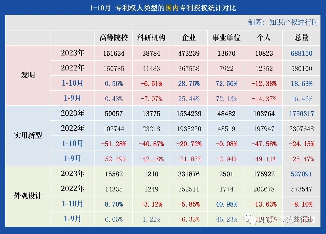 按照專利權(quán)人的類型進(jìn)行分類統(tǒng)計(jì)2023年1-10月國內(nèi)的專利授權(quán)量,5類專利權(quán)人的實(shí)用新型專利授權(quán)量全部下降。高等院校的實(shí)用新型授權(quán)量下降51.28%,個(gè)人類型的實(shí)用新型授權(quán)量下降47.58%;實(shí)用新型授權(quán)量下降55.95萬件(1-9月下降54.64萬件)。