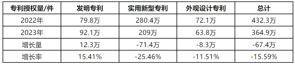 2023年我國實用新型專利授權(quán)量同比下降25.46%,發(fā)明專利同比增長15.41%,成首個有效發(fā)明專利量破400萬件的國家