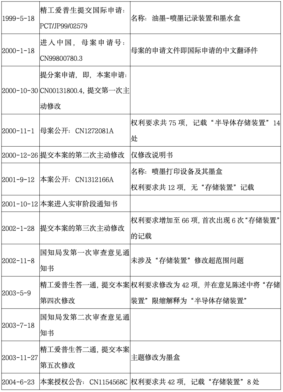 涉案專利(名稱為“墨盒”,專利號為ZL00131800.4)系國際申請(PCT/JP99/02579)進(jìn)入中國國家階段所形成的99800780.3號發(fā)明專利申請的分案申請。99800780.3號發(fā)明專利申請公開文本的權(quán)利要求書中并未出現(xiàn)獨(dú)立使用的“存儲裝置”用語,而是使用了“半導(dǎo)體存儲裝置”或者指代“半導(dǎo)體存儲裝置”的“所述外部存儲裝置”的概念。由上表可知,涉案專利自分案申請?zhí)岢鲋潦跈?quán),前后共進(jìn)行了5次修改。涉案專利申請人精工愛普生在第三次主動修改提交的權(quán)利要求書中未再出現(xiàn)“半導(dǎo)體存儲裝置”的記載,同時,該權(quán)利要求書中出現(xiàn)了“存儲裝置”的記載。隨后,國家知識產(chǎn)權(quán)局就涉案專利申請發(fā)出的第一次審查意見通知書中指出,精工愛普生新提交的權(quán)利要求書中的部分內(nèi)容超出了原說明書和權(quán)利要求書記載的范圍,不符合專利法第三十三條的規(guī)定。但是,該審查意見通知書并未對“存儲裝置”的修改是否符合專利法第三十三條的規(guī)定給出意見。精工愛普生針對第一次審查意見通知書提交的意見陳述中將“存儲裝置”特征引入新的權(quán)利要求1,并在其中解釋,“存儲裝置”是指圖7(b)所示的“半導(dǎo)體存儲裝置61”。審查員接受了該意見陳述,并最終予以授權(quán)公告。