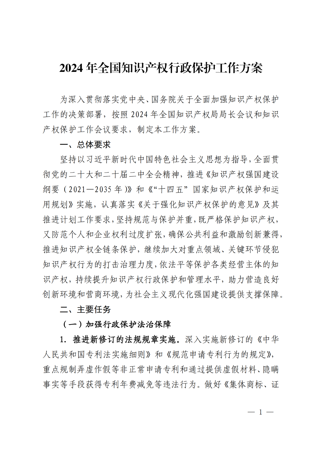 國家知識產(chǎn)權(quán)局關(guān)于印發(fā)2024年全國知識產(chǎn)權(quán)行政保護(hù)工作方案的通知