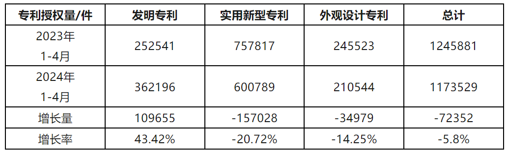 2024年1-4月我國(guó)實(shí)用新型專利同比下降20.72%,發(fā)明專利授權(quán)量同比增長(zhǎng)43.42%