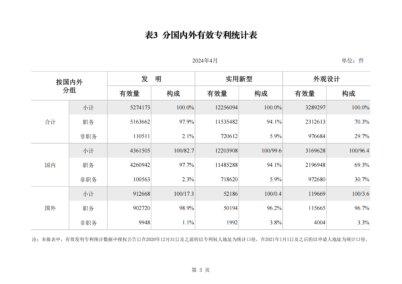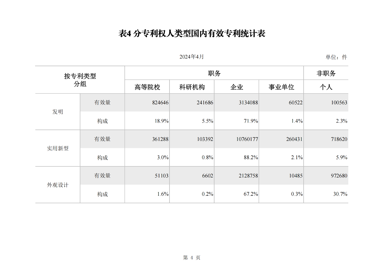 截至2024年4月底,我國(guó)發(fā)明專利有效量為527.4萬件。其中,國(guó)內(nèi)(不含港澳臺(tái))發(fā)明專利有效量428.7萬件。實(shí)用新型專利有效量為1225.6萬件。外觀設(shè)計(jì)專利有效量為328.9萬件。