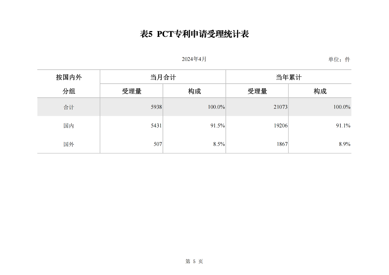 1-4月,我局受理PCT國(guó)際專利申請(qǐng)2.11萬件。其中,國(guó)內(nèi)申請(qǐng)人提交1.92萬件。1-4月,中國(guó)申請(qǐng)人共提交外觀設(shè)計(jì)國(guó)際申請(qǐng)676件1,
