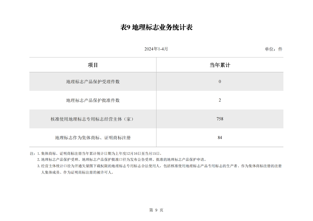 1-4月,我局批準(zhǔn)地理標(biāo)志產(chǎn)品保護(hù)申請(qǐng)2個(gè),核準(zhǔn)地理標(biāo)志作為集體商標(biāo)、證明商標(biāo)注冊(cè)84件,核準(zhǔn)使用地理標(biāo)志專用標(biāo)志經(jīng)營(yíng)主體758家。截至2024年4月,累計(jì)批準(zhǔn)地理標(biāo)志產(chǎn)品2510個(gè),累計(jì)核準(zhǔn)地理標(biāo)志作為集體商標(biāo)、證明商標(biāo)注冊(cè)7361件,核準(zhǔn)使用地理標(biāo)志專用標(biāo)志經(jīng)營(yíng)主體26406家。