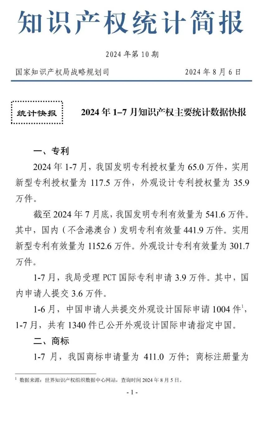 2024 年 1-7 月知識(shí)產(chǎn)權(quán)主要統(tǒng)計(jì)數(shù)據(jù)快報(bào)
