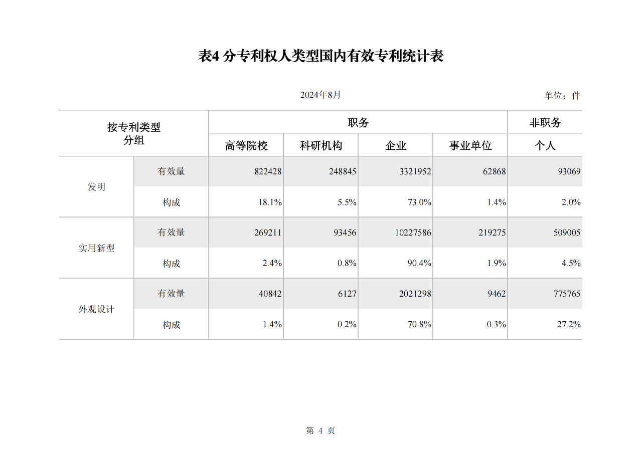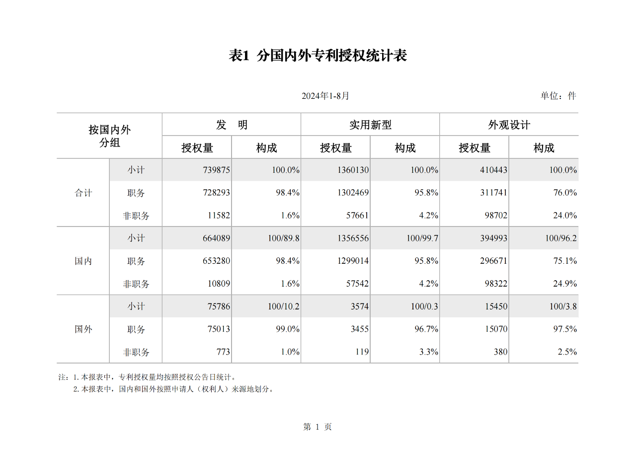 近日,國家知識產權局發(fā)布了2024年8月國家知識產權局審查注冊登記統(tǒng)計月報。相較于2023年1-8月,發(fā)明專利授權量同比增長21.59%,實用新型同比下降4.80%,外觀設計同比下降5.75%%。