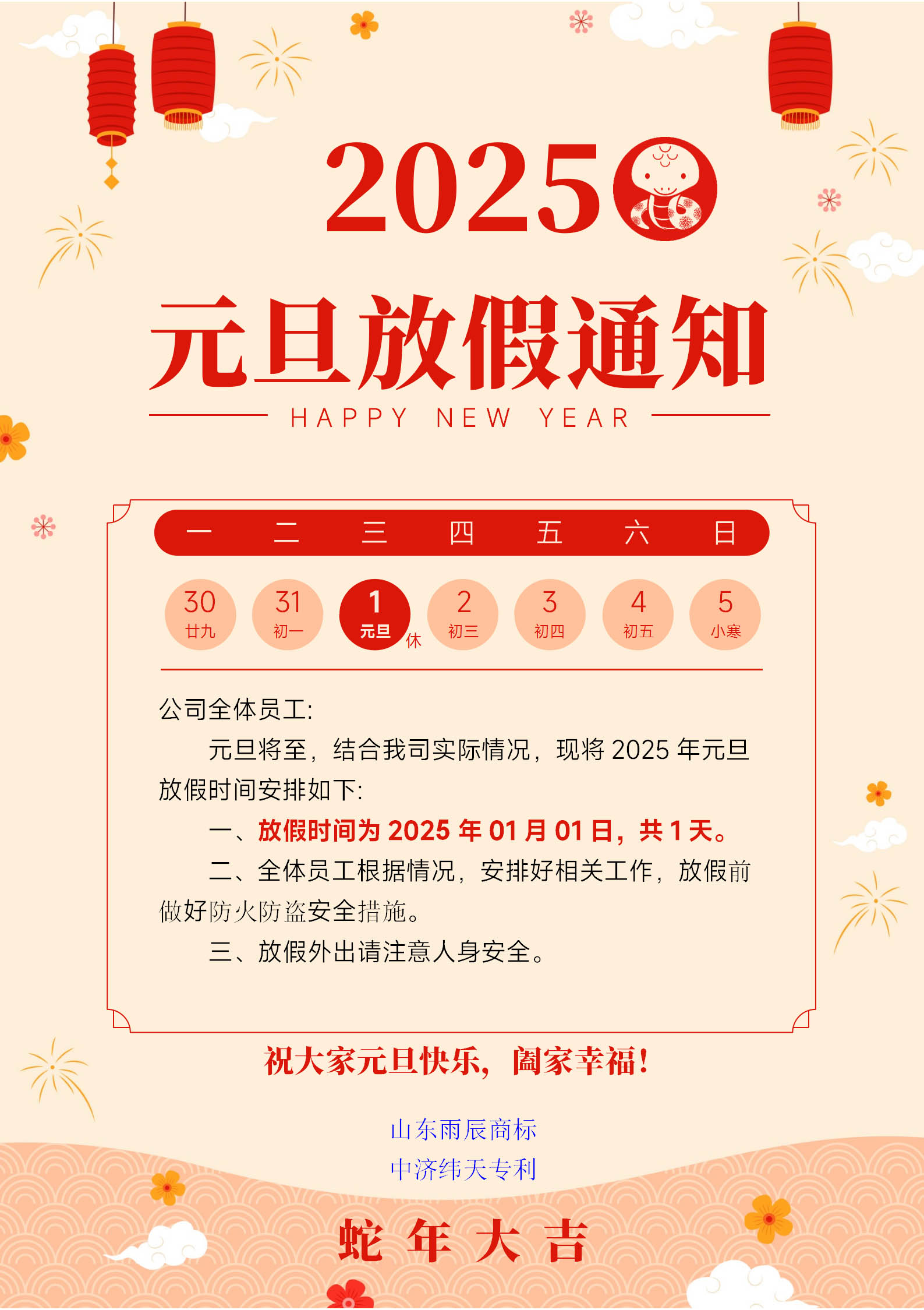 正值2025年元旦來臨之際,根據(jù)國家法定假期規(guī)定,并結(jié)合我司實(shí)際情況,現(xiàn)將2025年元旦放假安排如下: