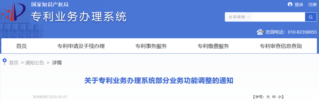 為進(jìn)一步提升專利業(yè)務(wù)辦理系統(tǒng)的便利性,專利業(yè)務(wù)辦理系統(tǒng)將于2025年5月8日18:00進(jìn)行系統(tǒng)更新,對(duì)部分功能進(jìn)行調(diào)整,具體內(nèi)容如下: