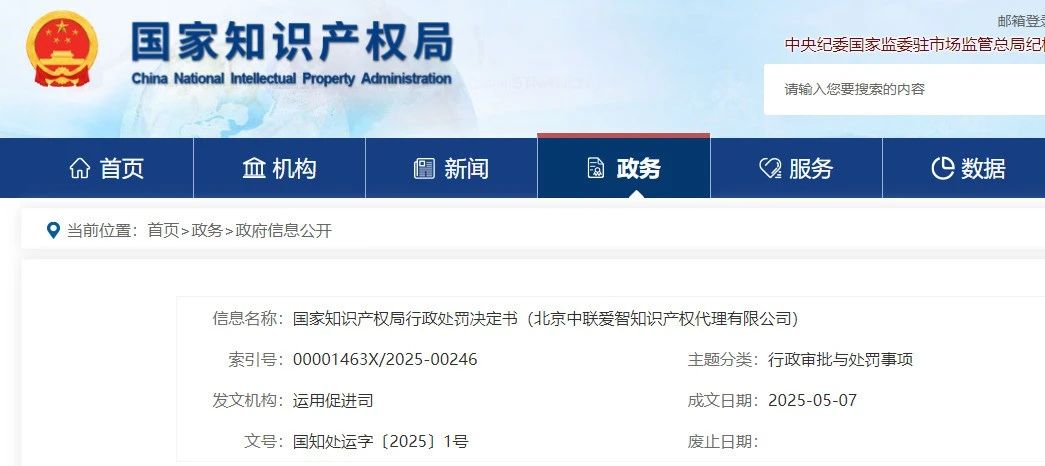 當(dāng)事人上述行為屬于《市場監(jiān)督管理嚴(yán)重違法失信名單管理辦法》第九條第(二)項“從事嚴(yán)重違法專利、商標(biāo)代理行為”,根據(jù)《市場監(jiān)督管理嚴(yán)重違法失信名單管理辦法》第二條、第十二條相關(guān)規(guī)定,決定將北京中聯(lián)愛智知識產(chǎn)權(quán)代理有限公司列入市場監(jiān)督管理嚴(yán)重違法失信名單,通過國家企業(yè)信用信息公示系統(tǒng)公示,并實施相應(yīng)管理措施。列入期限自2025年5月7日起至2028年5月6日。期滿一年后,當(dāng)事人可依據(jù)《市場監(jiān)督管理嚴(yán)重違法失信名單管理辦法》第十六條、第十七條規(guī)定向我局申請?zhí)崆耙瞥鰢?yán)重違法失信名單,停止公示相關(guān)信息并解除相應(yīng)管理措施。