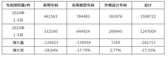 導(dǎo)讀:近日,國家知識產(chǎn)權(quán)局發(fā)布了2025年5月國家知識產(chǎn)權(quán)局審查注冊登記統(tǒng)計(jì)月報(bào)。相較于2024年1-4月,2025年1-4月發(fā)明專利授權(quán)量同比減少28.04%,實(shí)用新型同比下降17.79%,外觀設(shè)計(jì)增加2.77%。