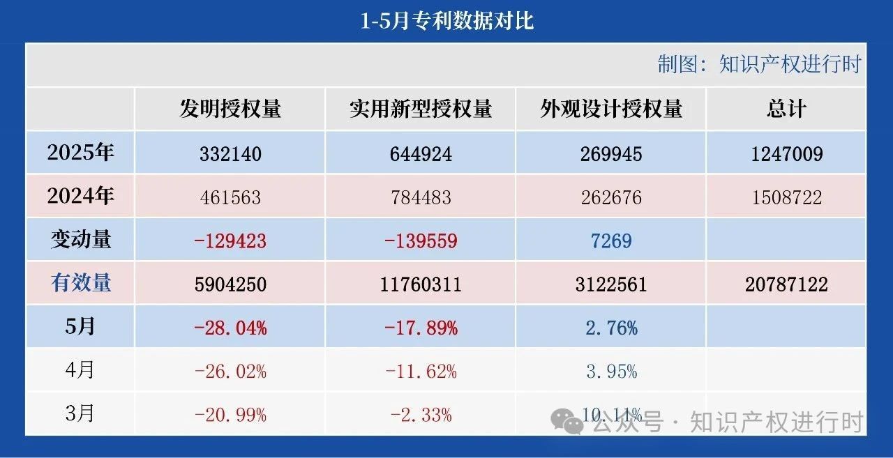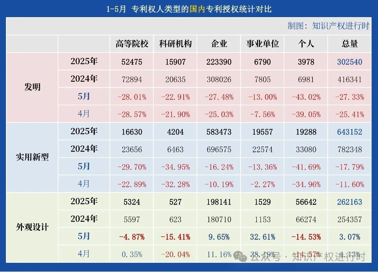 2025年1-5月發(fā)明專利授權(quán)率55%、授權(quán)量同比下降28%,高校同比下降28%,個(gè)人下降42%;實(shí)用新型授權(quán)量同比下降18%