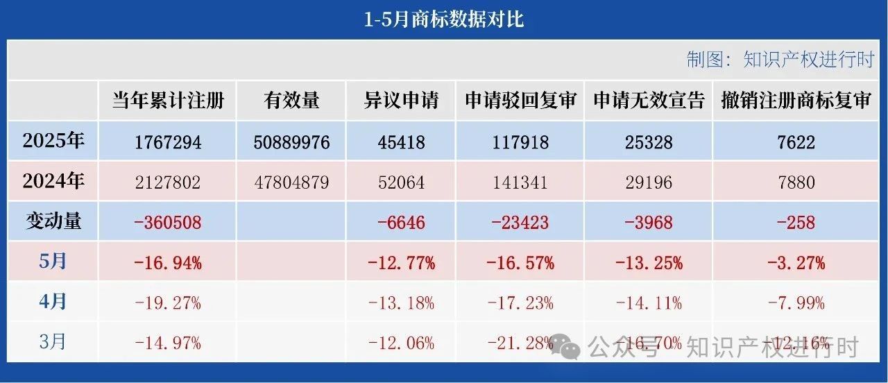 2025年1-5月商標(biāo)注冊(cè)量相比2024年商標(biāo)注冊(cè)量減少36.0508萬件(同比下降16.94%)。申請(qǐng)無效宣告同比下降13.25%,申請(qǐng)駁回復(fù)審?fù)?/span>下降16.57%,申請(qǐng)撤銷注冊(cè)商標(biāo)復(fù)審?fù)?/span>下降3.27%