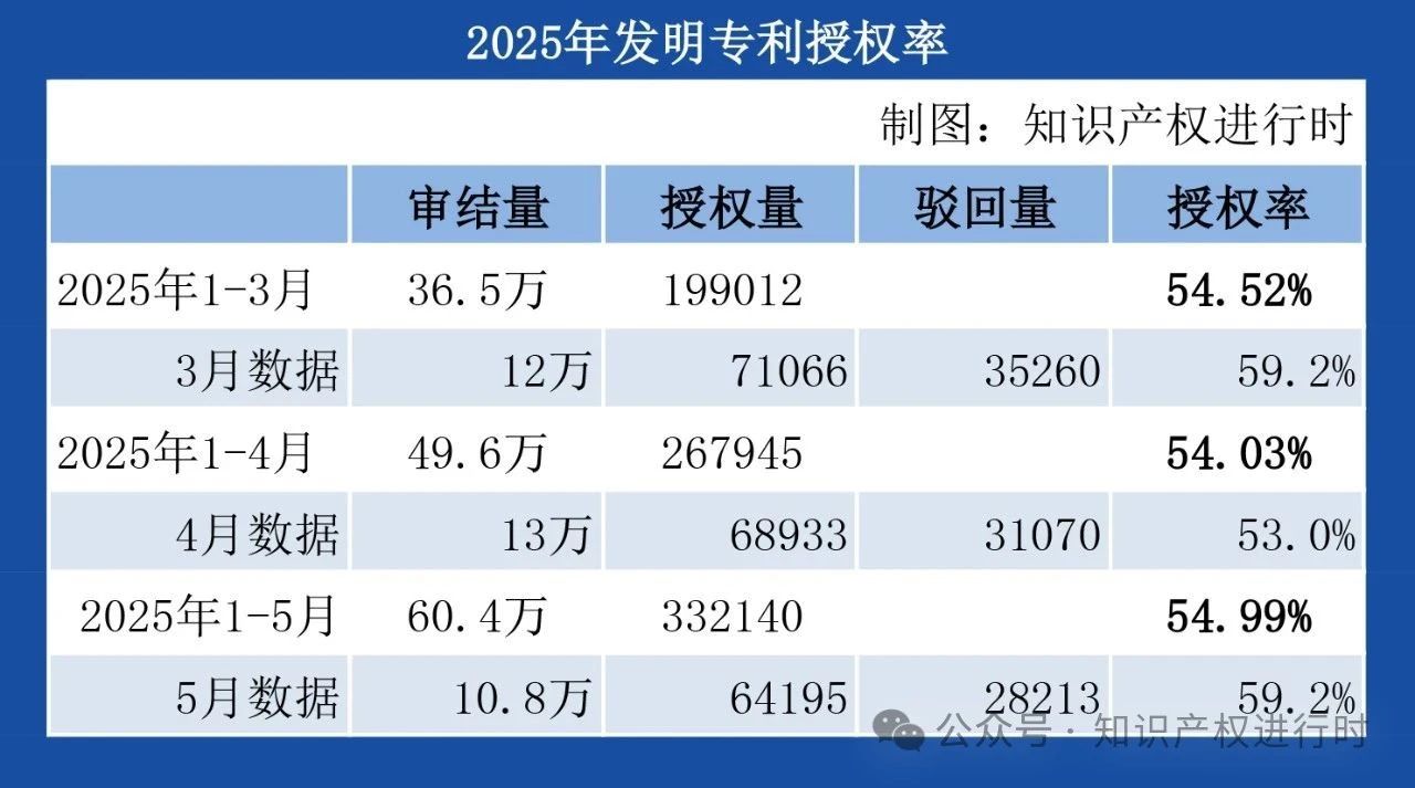 2025年1-5月發(fā)明專利授權(quán)率54.99%,5月當(dāng)月的發(fā)明專利授權(quán)率59.2%。整體上看,發(fā)明專利的授權(quán)率還是穩(wěn)定在54%-55%之間。注:發(fā)明專利授權(quán)率=授權(quán)量/審結(jié)量