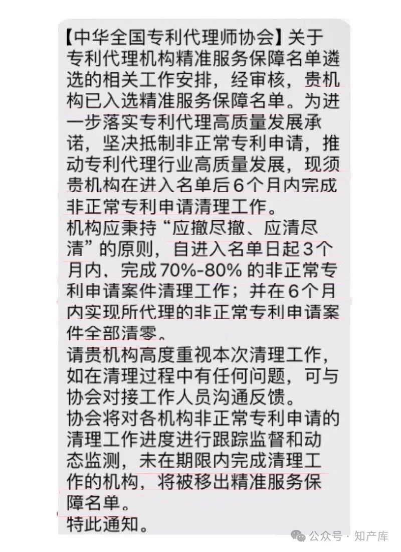 為進(jìn)一步落實(shí)專(zhuān)利代理高質(zhì)量發(fā)展承諾,堅(jiān)決抵制非正常專(zhuān)利申請(qǐng),推動(dòng)專(zhuān)利代理行業(yè)高質(zhì)量發(fā)展,現(xiàn)須貴機(jī)構(gòu)在進(jìn)入名單后6個(gè)月內(nèi)完成非正常專(zhuān)利申請(qǐng)清理工作。