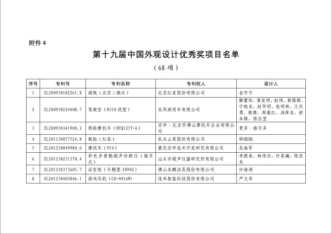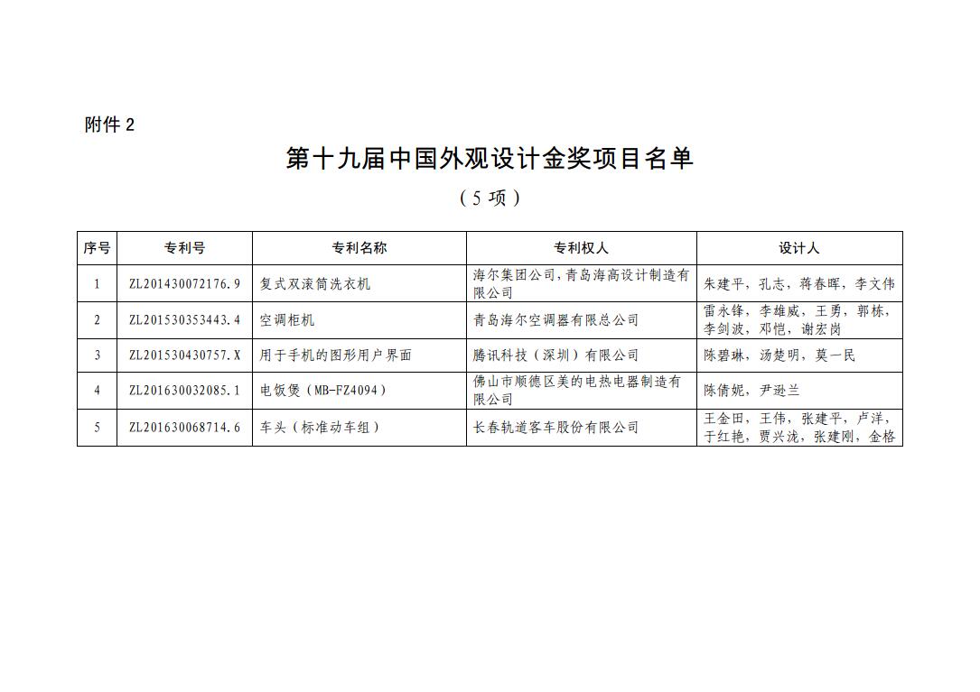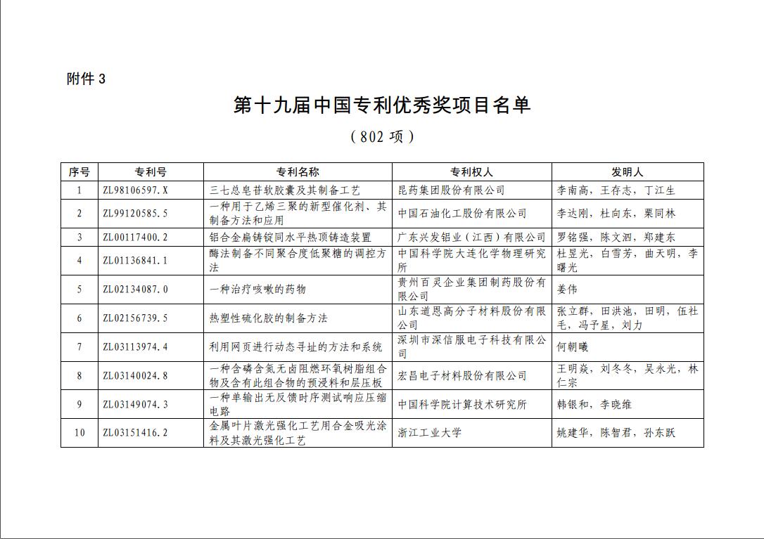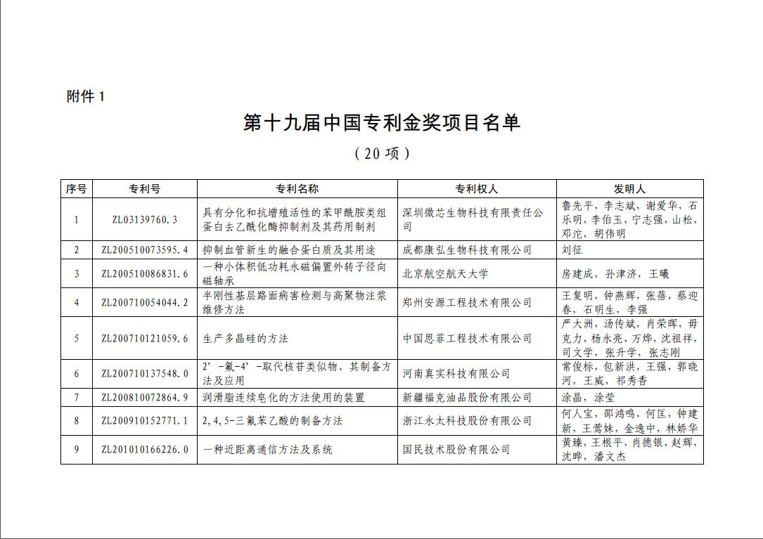第十九屆專利獎(jiǎng)獲獎(jiǎng)名單